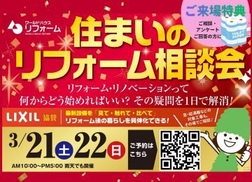 住まいのリフォーム相談会開催します! ― リフォーム・リノベーションの「わからない」を、1日で解消 ― 「そろそろリフォームを考えたいけれど、 何から始めればいいのかわからない」 「費用や工事内容、失敗しない進め方が不安…」 そんなお悩みをお持ちの方へ。 ワールドハウスリフォームでは、住まいの疑問をまとめて相談できるリフォーム相談会を開催します。 こんな方におすすめのイベントです ✔ リォーム・リノベーションを考え始めたばかりの方 ✔ 大型リフォーム・間取り変更・全面改修を検討している方 ✔ 水回り・窓・断熱・耐震など、部分的な改修を考えている方 ✔ 補助金や助成金を活用したリフォームを知りたい方 ✔ 太陽光・蓄電池に興味がある方 ✔ 具体的な事例や費用感を知りたい方 ✅ 相談は無料 ✅ しつこい営業はありません! ★WEB予約キャンペーン開催中!★ ご予約のお客様を優先でご案内いたしますので、よりスムーズでおすすめです! イベントでできること \リフォームのプロ/建築士による無料相談 住まいのプロである建築士が、 間取り・構造・性能・将来設計まで含めて丁寧にご相談をお受けします。 2026年最新 補助金相談 窓・給湯器・断熱改修など、 今使える補助金制度をわかりやすく解説。 「自分の家は対象になる?」という疑問もその場で確認できます。 最新設備機器の展示・体感(LIXIL協賛) キッチン・浴室・トイレなど、 実際に見て・触れて・比べられる展示をご用意しています。 ビフォー・アフター実例紹介 実際の施工事例をもとに、 リフォームでどのように暮らしが変わるのかを具体的にご紹介します。 太陽光・蓄電池相談 光熱費対策・災害時の備えとして注目される 太陽光・蓄電池についても個別にご相談いただけます。 \お任せください/対応可能なリフォーム内容 大型リフォーム・リノベーション 水回りリフォーム(キッチン・浴室・洗面・トイレ) 性能向上リフォーム(断熱・耐震) 防音リフォーム そのほか住まいに関するお悩み全般 地域密着半世紀、新築で培った「技術と信頼」が安心の証です! 相談会は1組1組個別での開催になりますので、リラックスしながらお話できます♪ もちろん、参加費は無料! また、ご来場プレゼントのほかにWEB予約いただいた方にはQUOカード1,000円分と「失敗しないリフォーム小冊子」をプレゼントさせていただきます! お子様連れの方には「ひのきちゃんグッズ」もご用意して大歓迎です♪ ※ご来場予約キャンペーンご留意事項※ 【プレゼント進呈条件】 ・ワールドハウスリフォームへのご来場が初めての方 ・本キャンペーン期間中にワールドハウスリフォームのHPにてご予約の上ご来場された方・ショールームにご来場の上、アンケートにすべて記入いただいた方 ・弊社施工エリア内でフルリノベーション・リフォームを計画されている方で、前向きにご検討またはリフォームが可能とスタッフが判断した方。不当にプレゼントを取得しようとされていると弊社がみなした場合はプレゼントの提供をお断りする場合がございます。 ・プレゼントは当キャンペーンでひと家族様1回のみ有効です。 ・ワールドハウスリフォーム、他社さま問わずご契約前の方 ・お渡しは在庫の状況によりご来場後や打ち合わせ後になる場合がございます。 ・前日の17:00までに予約の方 ・事前の予約状況によってはご予約時間帯を調整をさせていただきます。連絡の取りやすいお電話番号にてご予約下さい。 ・「ドメイン指定受信」を設定されている場合は、[koori.jp]からのメールを受信できるように設定してください。 ・「ドメイン指定受信」の関係で弊社よりお客様へメール送信できない場合は、お電話にて連絡させていただく場合がございます。 ・ご本人さま確認のため身分証明書などの書類ご提示のお願いをする場合がございます。