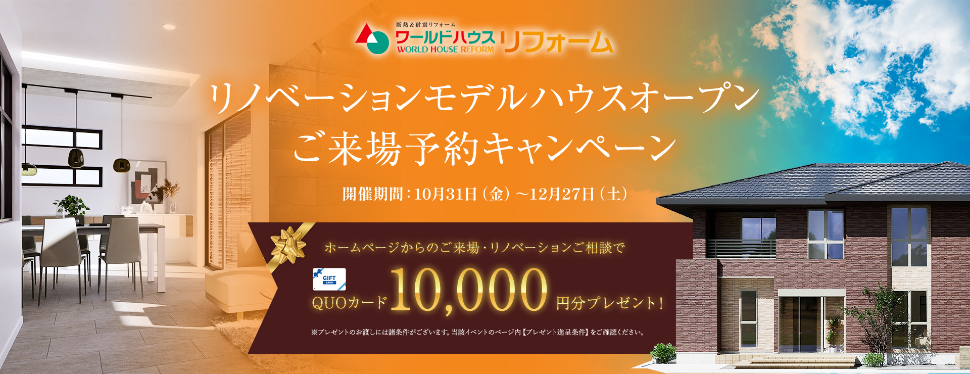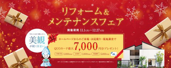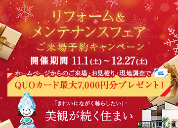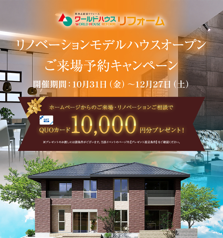 今年のな夏は暑かった!ようやく肌寒く感じるようになりました! と思ったら・・・もう11月ですね。ハロウィンも終わって、今年もあと2ヶ月です。 そろそろお家のメンテナンスやお掃除が気になる季節にもなりますね。 <こんな方におすすめ!> ◇こだわりのお家、ずっときれいに暮らしたい! ◇外壁塗装、そろそろだけどコストを抑えたい! ◇汚れやさびがなかなか落ちなくて・・・ そんなお悩みの皆さん、たくさんいらっしゃると思います。 びっくりするほどきれいになる!と大好評です(^^♪ 今回もメンテナンスキャンペーンでは、 プレゼントは最大でクオカードを7,000円分! もちろん、メンテナンス以外のリフォーム&リノベーション、増改築でも対象ですのでお気軽にご相談、ご予約くださいね! ☆彡 ①ご来場予約で・・・1000円分 ☆彡 ②お見積り依頼&ご提出で・・・1000円分 ☆彡 ③現地調査で・・・5000円! ※③のプレゼントに関しては、工事代金が10万円(税抜き)以上の方を対象といたします。 ※フルリノベーションの方は現地調査&見積提出で6000円プレゼントいたします。 ※アンケートへのご協力など下記注意事項・条件を必ずご確認ください。 お近くのショールームへご来場くださいね! ◇成田ショールーム ◇旭ショールーム ※必ずご確認ください※ 【プレゼント進呈条件】 ・ワールドハウスリフォームへのご来場が初めての方 ・本キャンペーン期間中にワールドハウスリフォームのHPにてご予約の上ご来場された方 ・ショールームにご来場の上、アンケートにすべて記入いただいた方 ・弊社施工エリア内でリフォーム工事(リノベーション・大規模リフォーム・増築・減築等を除く)を計画されている方で、前向きにご検討またはリフォームが可能とスタッフが判断した方。不当にプレゼントを取得しようとされていると弊社がみなした場合はプレゼントの提供をお断りする場合がございます。 ・ワールドハウスで開催されている他キャンペーンとの併用はできません。 ・ご本人様確認のため顔写真付き身分証明書をご提示いただける方 ・プレゼントは当キャンペーンでひと家族様1回のみ有効です。 ・希望されるリフォーム工事がご契約前の方 ・お渡しは在庫の状況によりご来場後や打ち合わせ後になる場合がございます。 ・前日の17:00までに予約の方 ・事前の予約状況によってはご予約時間帯を調整をさせていただきます。連絡の取りやすいお電話番号にてご予約下さい。 ・「ドメイン指定受信」を設定されている場合は、[koori.jp]からのメールを受信できるように設定してください。 ・「ドメイン指定受信」の関係で弊社よりお客様へメール送信できない場合は、お電話にて連絡させていただく場合がございます。 ・ご本人さま確認のため、身分証明書などの書類ご提示のお願いをする場合がございます。 .u-yellow { text-decoration: underline; text-decoration-color: yellow; text-decoration-thickness: 2px; text-underline-offset: 4px; }