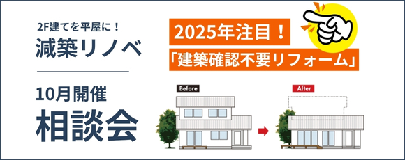 「階段の上り下り、当たり前ですか?将来の負担を減らす“平屋”という選択肢」 〈ご自宅や持ち家の減築リフォーム・リノベーションを検討している方向け相談会〉 ワールドハウスの「減築リノベ相談会」では、築20年以上の2階建て住宅を“平屋”へと減築するメリットやかかる費用などをわかりやすくご説明します。 【減築は確認申請が不要な分数十万~数百万円ほど手続きコストがかからない!】 2025年4月から始まった法改正(大規模リフォームの規制強化)があり、大幅に家を改装するときには建築確認申請が必要になるケースが増えます。リノベーションの内容によって築年数が古い木造住宅(既存図面が不十分、構造計算書がないなどのケース)で大規模改修の工事を行う場合、数十万~数百万円ほど手続きコストがかかりますが、リノベーション建築確認申請が不要となるため、2階を平屋にする減築リノベではコストを削減できます。 減築リノベーションが気になる方、詳しく話を聞いてみたい方は、お気軽にご参加くださいませ。 参加方法は、こちらのページから事前のご予約がスムーズです。遠方の方で来場が難しい場合はお電話でお気軽にご相談ください。 01|こんな方におすすめ 02|ワールドハウス リノベーションの特徴 経験豊富なスタッフが、あなたのお悩みやご相談に丁寧にお応えします。 03|個別相談会お申込みについて 減築リノベーションを具体的に検討されているお客様はもちろん、リノベーションが自分たちに合っているのかどうか一度話を聞いてみたいという方も大歓迎です。 工事中の住まいはどうするの? トータルでどのくらいかかるの? 住宅ローンについて教えてほしい などなど・・。 気になることにお応えします! ======================== ご参加方法は、 WEBからの事前予約・ショールーム来店 お電話でのご相談 お客様のご状況に合わせて承ります。 ======================== ■施工事例はこちら ▽他の施工事例を見る https://worldhouse-reform-koori.jp/gallery/ ■お客様の声はこちら ▽他のお客様の声を見る https://worldhouse-reform-koori.jp/voice/ ■関連記事はこちら 「光と風を取り込むセカンドライフに備えたリノベーション」 https://worldhouse-reform-koori.jp/blog/details_2456.html 「2階建てを平屋に減築するメリット・デメリット」 https://worldhouse-reform-koori.jp/blog/details_2273.html 「リノベーションで耐震性UP!安心して暮らせる家に」 https://worldhouse-reform-koori.jp/blog/details_2455.html ======================= ご参加方法は、 WEBからの事前予約・ショールーム来店 お電話でのご相談 お客様のご状況に合わせて承ります。 ======================== ◇ショールームご案内 旭ショールーム 住所 〒289-0517 千葉県旭市萬力3480-2 時間 9:00-17:00(水曜定休) TEL 0120-540-050 成田ショールーム 住所 〒286-0045 成田市並木町219-273 時間 9:00-17:00(水曜定休) TEL 0476-24-3377