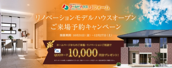 10/31(金)~ ワールドハウス旭住宅公園展示場がリニューアル GRAND OPEN! 「リノベ後の暮らしがイメージできる体感モデルハウス」 「間取りが古い」「家が暗い」「収納が足りない」――そんな住まいのお悩みをリノベーションで解決! 旭住宅公園のモデルハウスが、暮らしやすさを追求した“機能的な間取り”と“明るい快適空間”へと生まれ変わりました。新築のような体感と、リノベならではの工夫をぜひ実際にご覧ください。 ★ご来場予約キャンペーン開催中!★ ご予約のお客様を優先でご案内いたしますので、よりスムーズでおすすめです! ---------------------------------- ◇対象期間 10月31日(金)~12月27日(土)※水曜定休 ◇対象展示場 旭住宅公園展示場「レジェンダ」 ◇特典 新築、建て替え、リノベーション(大規模工事)をご検討の方、初めてご来場の方には【クオカード10,000円分】をプレゼント! ※【プレゼント進呈条件】をご確認ください <こんな方におすすめ!> .u-yellow { text-decoration: underline; text-decoration-color: yellow; text-decoration-thickness: 2px; text-underline-offset: 4px; } ✔ 新築とリノベ、どちらが良いか比較して考えたい方 ✔今の家に不便を感じていて”暮らしやさ”を体感したい方 ✔ 自然光を取り込んだ明るいリビングや効率的な家事動線に興味がある方 ✔ 収納や動線の工夫をリノベーションで取り入れたい方 ①暮らしやすさを高めた“機能的な間取り” 「動線が使いづらい」「部屋が狭くてくつろげない」そんな思いはありませんか? 今回の展示場は、家事動線上にあるファミリークロゼットや使い方いろいろ可能なワークコーナー、ヌックスペースなど、機能的な間取りをご体感いただけます♪ ②光を取り込む“明るいリビング空間” 「昼間でも照明が必要で暗い…」と感じたことはありませんか? 心地よい光が広がる吹き抜けリビングで毎日の日常が特別な時間に。モダンインテリアの空間をぜひご体感ください。 ③ 収納不足を解消する“すっきりリノベ” 「収納が足りず家が片付かない…」そんな悩みありませんか? 生活動線に合わせた収納で、使いやすさと片付けやすさを両立しました。 暮らしをイメージしながらご見学いただけます。 ④ 新築もリフォームも対応できる“リノベモデルハウス” 「リフォーム、リノベーションってどこに相談すれば…」リノベーション工事もお任せください! 「新築かリフォーム、どちらが自分たちに合うの?」そんなお悩みにも応えます! オープンなスペースとサンプルを見ながら話せる個室をご用意。リノベの不安や疑問もその場で解消できます。 詳しいお話がお聞きしたい方や実際にご体感されたい方は現地にてお待ちしております✨ 見学会当日は、家づくり相談会も同時に開催します。土地探し・資金・プラン・構造や工法のご相談など、お気軽にお声かけください。 また、土地がすでにお決まりの方は、土地の資料があればお話もスムーズです。 ******************************* 【展示場】 ワールドハウス旭住宅公園展示場(レジェンダ) 住所:千葉県旭市イ2071-6 旭住宅公園内 (水曜定休) ※ご来場予約キャンペーンご留意事項※ 【プレゼント進呈条件】 新築、建て替え、リノベーション(大規模・増築・減築)を弊社施工エリア内で3年内にご建築を計画されている方で、前向きに家づくりを検討または可能とスタッフが判断した方。また、不正行為と弊社がみなした場合はプレゼントの提供をお断りする場合がございます。 ご本人様確認のため顔写真付き身分証明書をご提示いただける方 ワールドハウスへご来場が初めての方 前日の17:00までに予約の方 ワールドハウスのHPにてご予約の上、ご来場された方 モデルハウスをご見学の上、アンケートにすべて記入いただいた方 プレゼントは当キャンペーンでひと家族様1回のみ有効です。 ワールドハウス、他社さま問わずご契約前の方 在庫の状況により、お渡しが後日になる場合がございます。 資料請求応援キャンペーンチラシをご持参の方のみ併用可能、他キャンペーンとの併用はできません。 事前の予約状況によってはご予約時間帯を調整をさせていただきます。連絡の取りやすいお電話番号にてご予約下さい。 「ドメイン指定受信」を設定されている場合は、[koori.jp]からのメールを受信できるように設定してください。 「ドメイン指定受信」の関係で弊社よりお客様へメール送信できない場合は、お電話にて連絡させていただく場合がございます。