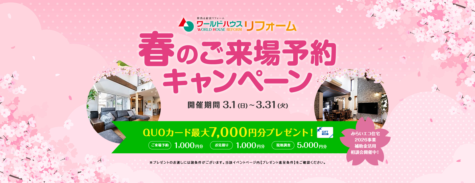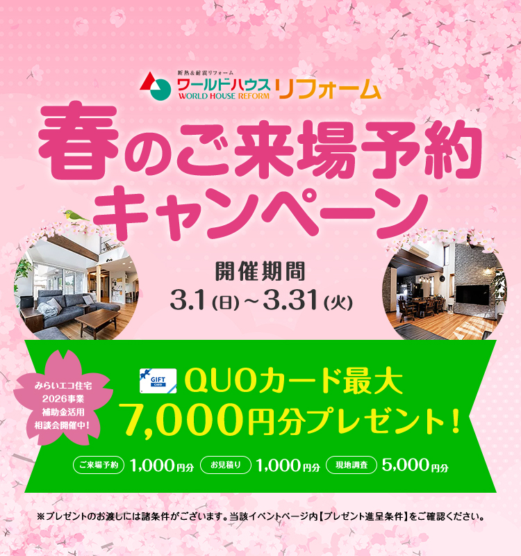 \2026年スタート!/ ☆リフォーム&リノベーション☆ ご来場予約キャンペーン開催いたします! 今年こそは直しておきたいお家のあんな所やこんなところありませんか? ワールドハウスリフォームに是非お任せください(^▽^)/ ★1月ご来場予約キャンペーン開催★ ご予約での来場、お見積もりなどでクオカードをプレゼントいたします! ◇リノベーションってなあに? リフォームや新築とどう違うの? ◇そろそろ外壁塗装した方が良いかな? ◇キッチンやお風呂、今はどんなのがあるのかしら?? ◇耐震診断はお願いできるの? 誰かに聞きたいけど、誰にきいたら?・・・そんな方も多いと思います。 なかなか機会がなくて・・・そんな方はぜひワールドハウスリフォームにご相談ください! 地域で半世紀、7000棟を超える新築の実績と経験が、 お客様の快適な暮らしのサポートをいたします(^^)/ プレゼントは最大でクオカードを7000円分!(^^)! ☆彡 ①ご来場予約で・・・1000円分 ☆彡 ②お見積り依頼&ご提出で・・・1000円分 ☆彡 ③現地調査で・・・5000円! ※③のプレゼントに関しては、工事代金が10万円(税抜き)以上の方を対象といたします。 ※フルリノベーションの方は現地調査&見積提出で6000円プレゼントいたします。 ※アンケートへのご協力など下記注意事項・条件を必ずご確認ください。 ※必ずご確認ください※ 【プレゼント進呈条件】 ・ワールドハウスリフォームへのご来場が初めての方 ・本キャンペーン期間中にワールドハウスリフォームのHPにてご予約の上ご来場された方 ・ショールームにご来場の上、アンケートにすべて記入いただいた方 ・弊社施工エリア内でフルリノベーション・リフォームを計画されている方で、前向きにご検討またはリフォームが可能とスタッフが判断した方。不当にプレゼントを取得しようとされていると弊社がみなした場合はプレゼントの提供をお断りする場合がございます。 ・プレゼントは当キャンペーンでひと家族様1回のみ有効です。 ・ワールドハウスリフォーム、他社さま問わずご契約前の方 ・お渡しは在庫の状況によりご来場後や打ち合わせ後になる場合がございます。 ・前日の17:00までに予約の方 ・事前の予約状況によってはご予約時間帯を調整をさせていただきます。連絡の取りやすいお電話番号にてご予約下さい。 ・「ドメイン指定受信」を設定されている場合は、[koori.jp]からのメールを受信できるように設定してください。 ・「ドメイン指定受信」の関係で弊社よりお客様へメール送信できない場合は、お電話にて連絡させていただく場合がございます。 ・ご本人さま確認のため身分証明書などの書類ご提示のお願いをする場合がございます。