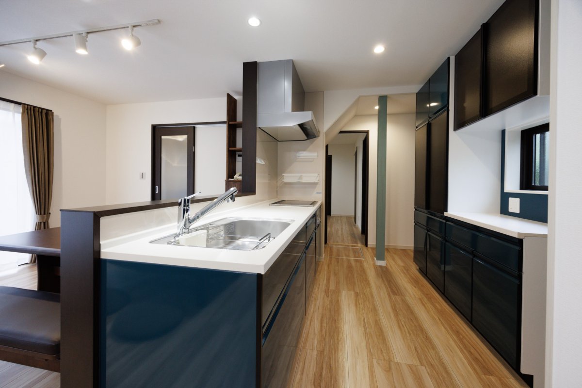 対面キッチンからは玄関ホール・水廻りにダイレクトにつながり、家事がしやすい回遊性のある動線になっています。