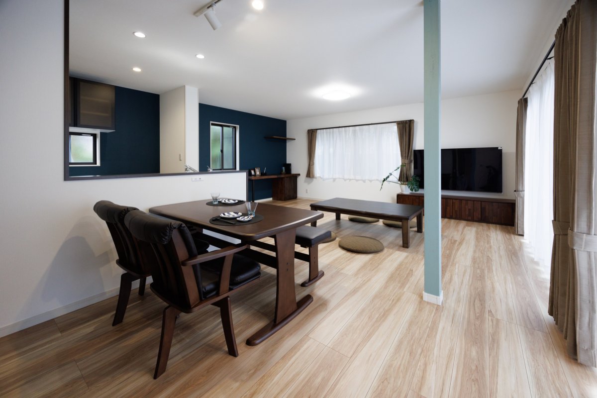 深いブルーのアクセントウォールとナチュラルな床材を合わせることで、和の名残を感じながらもモダンな印象に。木のぬくもりと開放感を両立したリビングです。