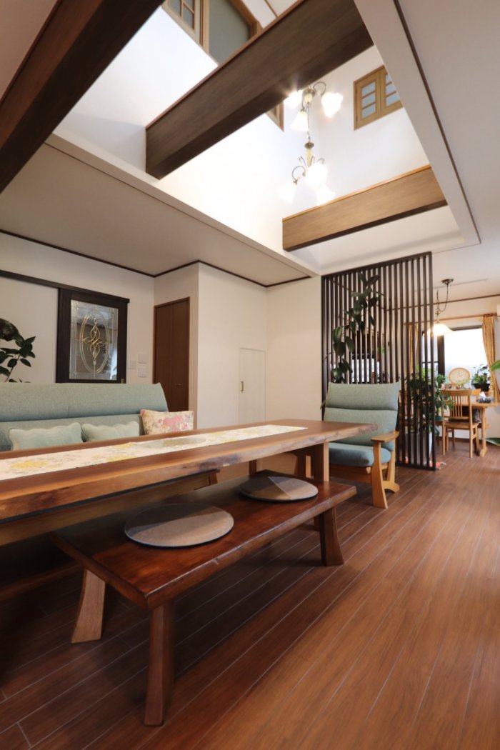 リフォーム中に一枚板のダイニングテーブルを購入され、その存在感に合わせて床や建具の色味を統一しました。DIY好きのご夫婦ならではの感性が随所に光る、温もりあるインテリアです。
