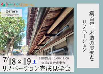 築100年!大正13年に建てた実家を 基礎からしっかり 部分最適リノベーションしました! 実家リノベーション完成見学会開催します! 今回は旅館だったご実家の約半分程度を、家族で過ごす暮らしのスペースに、部分最適リノベーション。 築100年を超えるお家は、基礎も床も壁も、もちろん昔の仕様。安心して暮らせるように、基礎を作り替え、壁、天井、床など構造をしっかりと補強して新しいキッチンやユニットバスなどの新たな設備で快適な住まいに生まれ変わります! ↓ こちらは施工中の画像です 【こんな方はぜひ!】 □建て替えほどはお金はかけたくない方 □暑くて寒くて、光熱費も高い!と感じている方 □バリアフリーで暮らしを楽にしたい □家族構成が変わった方におすすめ! 実際のお家を見学しながら リノベーションのさまざまな疑問やお悩みにお応えします。 リノベーションって何が出来るの…? 建て替えとはどう違うの…? メリット・デメリットは? 補助金ってどのくらい使えるの? などなど、些細なことでも聞こうか迷ったことでもお気軽にお尋ねください(^▽^)/ 7000棟以上の新築工事で培った技術とノウハウで、お施主様のお困りごとやご要望にお応えします。 よくある質問Q&A! ――ワールドハウスにご相談されるリフォームには、どんな内容があるんでしょうか? ワールドハウスリフォームスタッフ(以下スタッフ): 水回りなど一部分のリフォームもありますが、ワールドハウスでは新築住宅に近い感覚のリフォームをされる方も多いですね。 たとえば、中古物件を購入してフルリフォームする、実家の母屋を大きくリフォームする、といったケースはいま増えています。 ――リフォームといっても、一部分ではない場合も多いのですね。 スタッフ: はい。それに当社では、最初からリフォームのみを希望されている方ばかりではありません。 真新しい新築住宅をあらたに購入するよりも、手頃な中古物件や、実家にもともとある住宅を生かして予算を抑え、住宅以外にも費用を充てたいという考えの方も、以前に比べて増えているように感じます。 また、ご結婚などを機に新築を建てたいと相談に来られ、お話を聞いていくうちに、手を入れたい場所や予算などを鑑みて、リフォームのほうがベターだと当社からアドバイスすることもありますよ。 ――新築住宅かリフォームの、どちらかだけではないのですか? スタッフ: はい、どちらも提案します。というのも、当社は新築住宅とリフォーム両方を手掛けているので、両方の目線からフラットに提案ができるんです。 現に「リフォーム会社に相談するとリフォームの話しか聞けないので、両方やっているワールドハウスさんに相談したくて来ました」と言われる方もおられましたよ。 ――おっしゃるとおり、新築住宅だけの会社であれば新築の話に、リフォームだけの会社ならリフォームだけの話になり、比較して考えられませんよね。 スタッフ: そもそも、リフォームは老朽化した建築物を新築に近い状態に近づけることを指し、リノベーションは既存の中古物件などを工事し、既存のものよりも価値を高めることを指します。 ワールドハウスが行うリフォームには、この2つの要素が混じり合っています。つまり、部分的なものから、家一棟をそのまま新築のように変えることまで、幅広く対応できるんです。 そしてこれができるのは、新築住宅をつくる技術と知識、つまり「家づくり」を熟知しているから。お客さまもそういう点に期待して、当社に相談されたのだと思いますよ。 ――両方のアドバイスをもらえれば、思考が偏ることなく公平に、費用や工事期間などを考えられますね。 スタッフ: そうですね。お客さまがしっかりと考えられるための情報を適切に、多角的にお伝えし、お客さまが納得して家づくりに進めるように導いていくことが大事なのだと考えています。 見学会では実際のお家を見ていただきながら、 リノ ベーションのさまざまな疑問やお悩みにお応えします。 ご来場の方には、リフォームやリノベーションについてのことがわかる ワールドハウスリフォームのカタログをもれなくプレゼントいたします! ぜひご来場ください(^^)/ スタッフ一同心よりお待ち申し上げております!