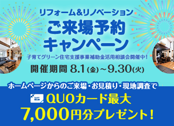 \この夏を快適に!/ ☆リフォーム&リノベーション☆ ご来場予約キャンペーン開催いたします! 毎日暑い日が続きます! 補助金リフォームがお得な今限定で☆彡ご来場予約キャンペーン開催です♪ ご予約での来場、お見積もりなどでクオカードをプレゼントいたします! ◇リノベーションってなあに? リフォームや新築とどう違うの? ◇補助金リフォーム、今からでも大丈夫? ◇キッチンやお風呂、今はどんなのがあるのかしら?? ◇耐震診断はお願いできるの? 誰かに聞きたいけど、誰にきいたら?・・・そんな方も多いと思います。 なかなか機会がなくて・・・そんな方はぜひワールドハウスリフォームにご相談ください! 地域で半世紀、7000棟を超える新築の実績と経験が、 お客様の快適な暮らしのサポートをいたします(^^)/ プレゼントは最大でクオカードを7000円分!(^^)! ☆彡 ①ご来場予約で・・・1000円分 ☆彡 ②お見積り依頼&ご提出で・・・1000円分 ☆彡 ③現地調査で・・・5000円! ※③のプレゼントに関しては、工事代金が10万円(税抜き)以上の方を対象といたします。 ※フルリノベーションの方は現地調査&見積提出で6000円プレゼントいたします。 ※アンケートへのご協力など下記注意事項・条件を必ずご確認ください。 ※必ずご確認ください※ 【プレゼント進呈条件】 ・ワールドハウスリフォームへのご来場が初めての方 ・本キャンペーン期間中にワールドハウスリフォームのHPにてご予約の上ご来場された方 ・ショールームにご来場の上、アンケートにすべて記入いただいた方 ・弊社施工エリア内でフルリノベーション・リフォームを計画されている方で、前向きにご検討またはリフォームが可能とスタッフが判断した方。不当にプレゼントを取得しようとされていると弊社がみなした場合はプレゼントの提供をお断りする場合がございます。 ・プレゼントは当キャンペーンでひと家族様1回のみ有効です。 ・ワールドハウスリフォーム、他社さま問わずご契約前の方 ・お渡しは在庫の状況によりご来場後や打ち合わせ後になる場合がございます。 ・前日の17:00までに予約の方 ・事前の予約状況によってはご予約時間帯を調整をさせていただきます。連絡の取りやすいお電話番号にてご予約下さい。 ・「ドメイン指定受信」を設定されている場合は、[koori.jp]からのメールを受信できるように設定してください。 ・「ドメイン指定受信」の関係で弊社よりお客様へメール送信できない場合は、お電話にて連絡させていただく場合がございます。 ・ご本人さま確認のため身分証明書などの書類ご提示のお願いをする場合がございます。