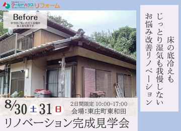 40年間ずっと悩んでいた 冬の底冷えとまとわりつく湿気、もう我慢しない! 暮らし改善『リノベーション完成見学会』開催です 毎週のように湿気取りを購入してクロゼット置くほどの湿気に、40年悩まされてきたお施主さま。冬は底冷えに悩まされる毎日。 和室ばかりの6部屋は収納も少なく、傷んできた床や部屋の段差もまとめてリノベーションすることで、家族皆が快適に過ごせる家に生まれ変わりました! ↓ こちらは施工中の画像です 地中からの湿気を防ぐ防湿コンクリートを施工しています。 壁面、天井にまんべんなくしっかりと断熱材を施工しました。 【こんな方はぜひ!】 □建て替えほどはお金はかけたくない方 □暑くて寒くて、光熱費も高い!と感じている方 □バリアフリーで暮らしを楽にしたい □家族構成が変わった方におすすめ! 実際のお家を見学しながら リノベーションのさまざまな疑問やお悩みにお応えします。 リノベーションって何が出来るの…? 建て替えとはどう違うの…? メリット・デメリットは? 補助金ってどのくらい使えるの? などなど、些細なことでも聞こうか迷ったことでもお気軽にお尋ねください(^▽^)/ 7000棟以上の新築工事で培った技術とノウハウで、お施主様のお困りごとやご要望にお応えします。 よくある質問Q&A! ――ワールドハウスにご相談されるリフォームには、どんな内容があるんでしょうか? ワールドハウスリフォームスタッフ(以下スタッフ): 水回りなど一部分のリフォームもありますが、ワールドハウスでは新築住宅に近い感覚のリフォームをされる方も多いですね。 たとえば、中古物件を購入してフルリフォームする、実家の母屋を大きくリフォームする、といったケースはいま増えています。 ――リフォームといっても、一部分ではない場合も多いのですね。 スタッフ: はい。それに当社では、最初からリフォームのみを希望されている方ばかりではありません。 真新しい新築住宅をあらたに購入するよりも、手頃な中古物件や、実家にもともとある住宅を生かして予算を抑え、住宅以外にも費用を充てたいという考えの方も、以前に比べて増えているように感じます。 また、ご結婚などを機に新築を建てたいと相談に来られ、お話を聞いていくうちに、手を入れたい場所や予算などを鑑みて、リフォームのほうがベターだと当社からアドバイスすることもありますよ。 ――新築住宅かリフォームの、どちらかだけではないのですか? スタッフ: はい、どちらも提案します。というのも、当社は新築住宅とリフォーム両方を手掛けているので、両方の目線からフラットに提案ができるんです。 現に「リフォーム会社に相談するとリフォームの話しか聞けないので、両方やっているワールドハウスさんに相談したくて来ました」と言われる方もおられましたよ。 ――おっしゃるとおり、新築住宅だけの会社であれば新築の話に、リフォームだけの会社ならリフォームだけの話になり、比較して考えられませんよね。 スタッフ: そもそも、リフォームは老朽化した建築物を新築に近い状態に近づけることを指し、リノベーションは既存の中古物件などを工事し、既存のものよりも価値を高めることを指します。 ワールドハウスが行うリフォームには、この2つの要素が混じり合っています。つまり、部分的なものから、家一棟をそのまま新築のように変えることまで、幅広く対応できるんです。 そしてこれができるのは、新築住宅をつくる技術と知識、つまり「家づくり」を熟知しているから。お客さまもそういう点に期待して、当社に相談されたのだと思いますよ。 ――両方のアドバイスをもらえれば、思考が偏ることなく公平に、費用や工事期間などを考えられますね。 スタッフ: そうですね。お客さまがしっかりと考えられるための情報を適切に、多角的にお伝えし、お客さまが納得して家づくりに進めるように導いていくことが大事なのだと考えています。 見学会では実際のお家を見ていただきながら、 リノ ベーションのさまざまな疑問やお悩みにお応えします。 ご来場の方には、リフォームやリノベーションについてのことがわかる ワールドハウスリフォームのカタログをもれなくプレゼントいたします! ぜひご来場ください(^^)/ スタッフ一同心よりお待ち申し上げております!