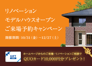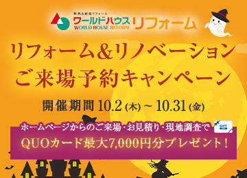\お家のメンテナンスの秋/ ☆リフォーム&リノベーション☆ ご来場予約キャンペーン開催いたします! ようやく暑さも和らぎ、過ごしやすい気温になってきましたね! 出かけやお家時間が快適になるこの時期は、住まいの点検やリフォームにぴったりのタイミングです。 ★10月ご来場予約キャンペーン開催★ ご予約での来場、お見積もりなどでクオカードをプレゼントいたします! ◇リノベーションってなあに? リフォームや新築とどう違うの? ◇そろそろ外壁塗装した方が良いかな? ◇キッチンやお風呂、今はどんなのがあるのかしら?? ◇耐震診断はお願いできるの? 誰かに聞きたいけど、誰にきいたら?・・・そんな方も多いと思います。 なかなか機会がなくて・・・そんな方はぜひワールドハウスリフォームにご相談ください! 地域で半世紀、7000棟を超える新築の実績と経験が、 お客様の快適な暮らしのサポートをいたします(^^)/ プレゼントは最大でクオカードを7000円分!(^^)! ☆彡 ①ご来場予約で・・・1000円分 ☆彡 ②お見積り依頼&ご提出で・・・1000円分 ☆彡 ③現地調査で・・・5000円! ※③のプレゼントに関しては、工事代金が10万円(税抜き)以上の方を対象といたします。 ※フルリノベーションの方は現地調査&見積提出で6000円プレゼントいたします。 ※アンケートへのご協力など下記注意事項・条件を必ずご確認ください。 ※必ずご確認ください※ 【プレゼント進呈条件】 ・ワールドハウスリフォームへのご来場が初めての方 ・本キャンペーン期間中にワールドハウスリフォームのHPにてご予約の上ご来場された方 ・ショールームにご来場の上、アンケートにすべて記入いただいた方 ・弊社施工エリア内でフルリノベーション・リフォームを計画されている方で、前向きにご検討またはリフォームが可能とスタッフが判断した方。不当にプレゼントを取得しようとされていると弊社がみなした場合はプレゼントの提供をお断りする場合がございます。 ・プレゼントは当キャンペーンでひと家族様1回のみ有効です。 ・ワールドハウスリフォーム、他社さま問わずご契約前の方 ・お渡しは在庫の状況によりご来場後や打ち合わせ後になる場合がございます。 ・前日の17:00までに予約の方 ・事前の予約状況によってはご予約時間帯を調整をさせていただきます。連絡の取りやすいお電話番号にてご予約下さい。 ・「ドメイン指定受信」を設定されている場合は、[koori.jp]からのメールを受信できるように設定してください。 ・「ドメイン指定受信」の関係で弊社よりお客様へメール送信できない場合は、お電話にて連絡させていただく場合がございます。 ・ご本人さま確認のため身分証明書などの書類ご提示のお願いをする場合がございます。