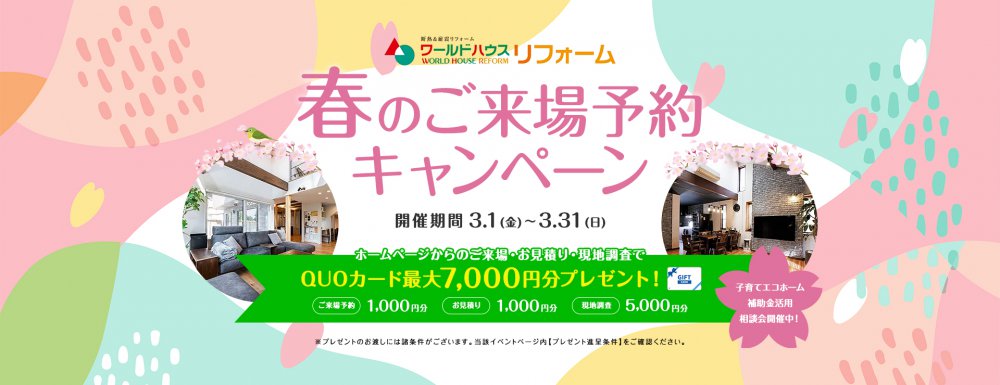 ・本キャンペーン期間中にワールドハウスリフォームのHPにてご予約の上ご来場された方