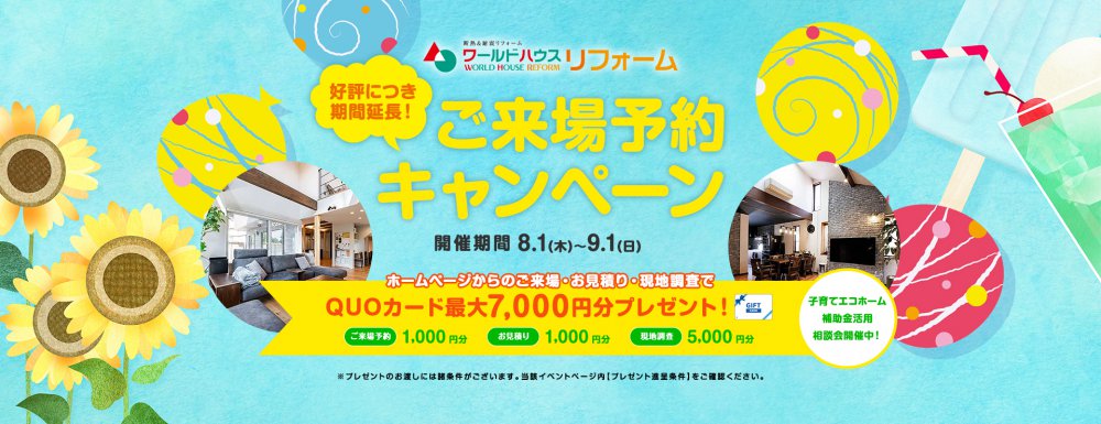 ・本キャンペーン期間中にワールドハウスリフォームのHPにてご予約の上ご来場された方