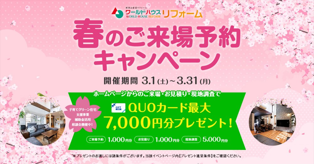 ・本キャンペーン期間中にワールドハウスリフォームのHPにてご予約の上ご来場された方