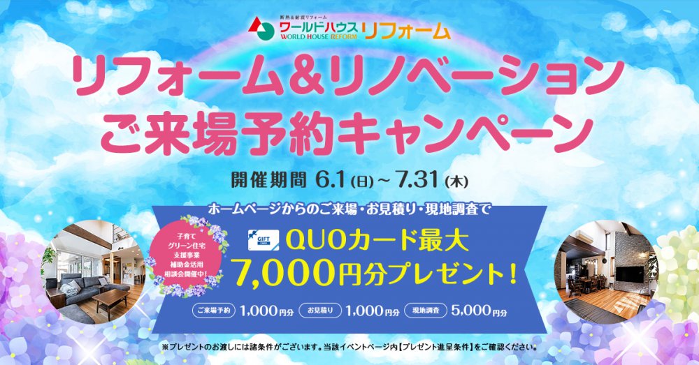 ・本キャンペーン期間中にワールドハウスリフォームのHPにてご予約の上ご来場された方