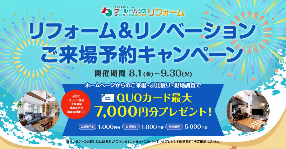 ・本キャンペーン期間中にワールドハウスリフォームのHPにてご予約の上ご来場された方