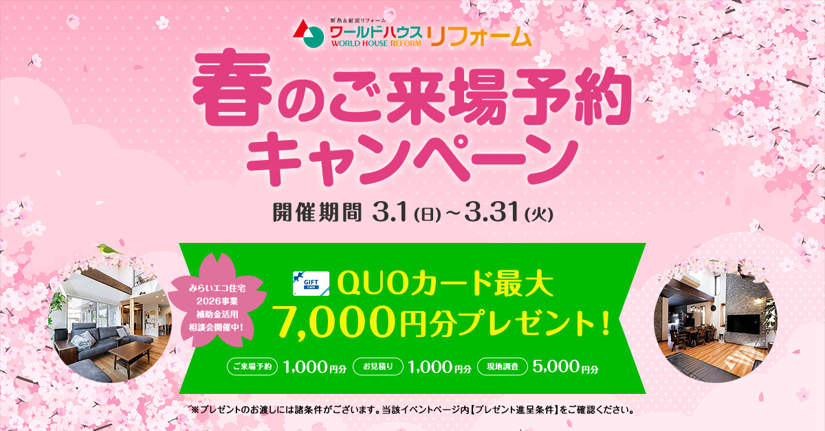 ・本キャンペーン期間中にワールドハウスリフォームのHPにてご予約の上ご来場された方・ショールームにご来場の上、アンケートにすべて記入いただいた方
