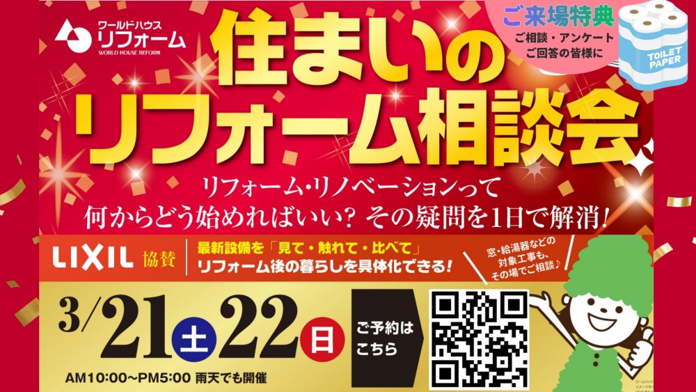 ワールドハウスリフォームでは、住まいの疑問をまとめて相談できるリフォーム相談会を開催します。