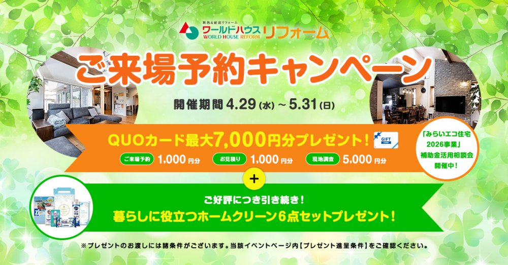 ・本キャンペーン期間中にワールドハウスリフォームのHPにてご予約の上ご来場された方
