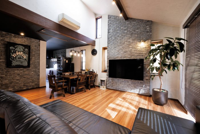間取りでは、以前は和室だった部屋をリフォームしてリモートワークの時は仕事部屋として使用しています。畳からフローリングに変え、吊り戸で部屋を仕切れるように作ってもらいました。吊り戸のブルックリンスタイルな感じがかっこよくて気に入っています。押し入れだった部分も洋室に合わせてクロゼットにして洋服がスッキリ収納できます。そして、家族がくつろぐリビングには新たにテレビの壁を作りました。ダイニングやリビングのどちらからもテレビが見やすくなり、ビンテージのインテリアに合わせてタイルをチョイスして正解。